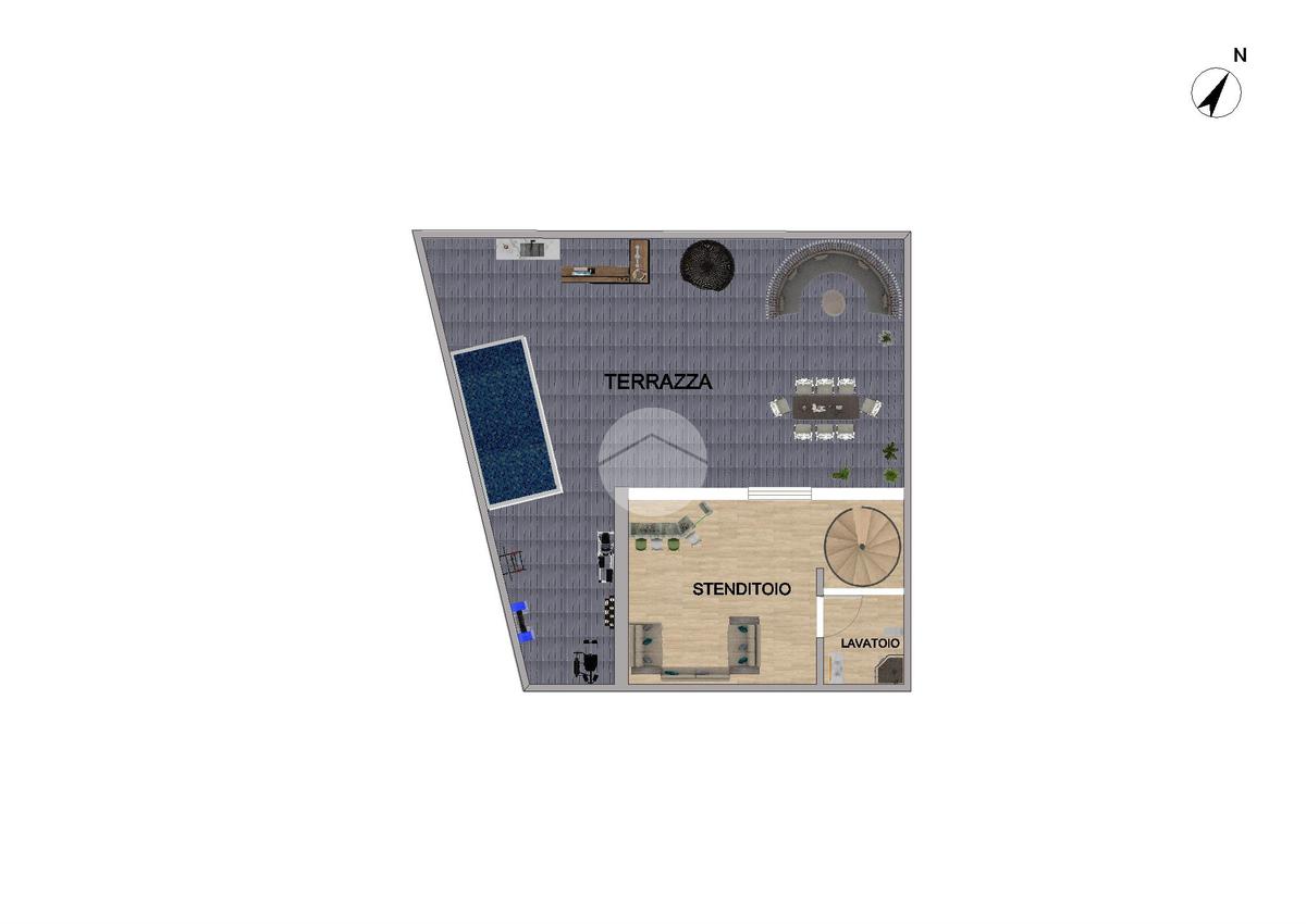 Una comoda scala interna porta al piano superiore, composto da lavatoio, stenditoio e l'accesso esclusivo a uno spazioso terrazzo con esposizone sud/ovest di circa 80m², attualmente in fase di ristrutturazione.