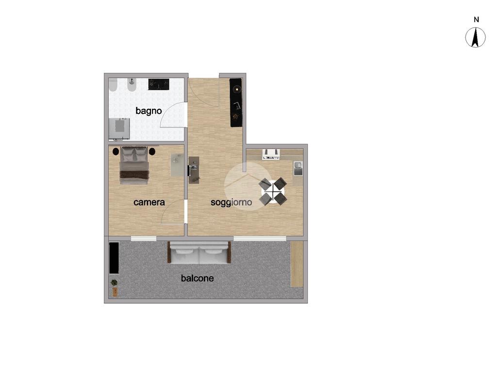 Ingresso su salone con angolo cottura ottimamente distribuito, zona notte riservata che garantisce privacy, bagno funzionale con doccia e un balcone vivibile con affaccio libero. Superficie e Piano: 37 mq interni, situato al 2° con ascensore.